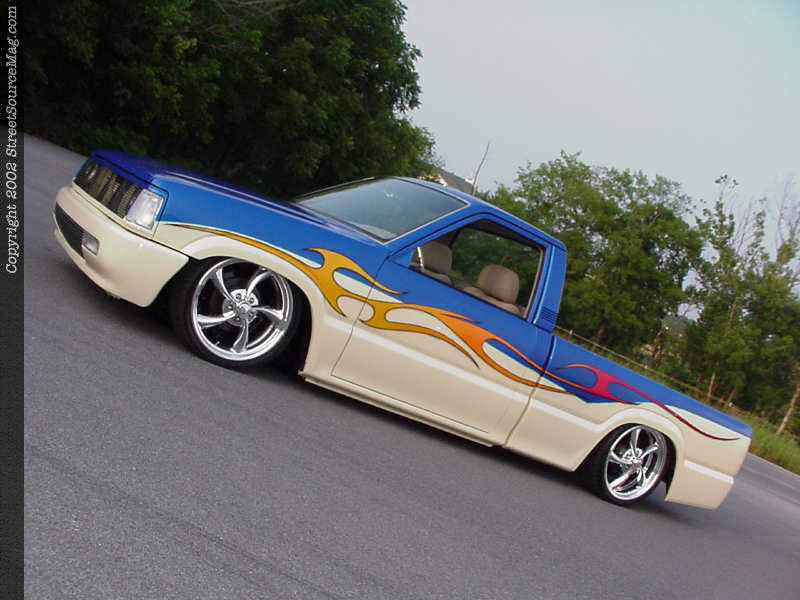 As with any custom vehicle, the suspension had to be altered to fit the owner's tastes. Andrew's Mazda needed to be sitting just a tad lower than stock height so the necessary steps were taken to achieve this. Up front, Andrew installed drop spindles from AIM Industries to drop the Mazda's nose a few inches closer to the pavement. This wasn't enough, so Andrew took the time to fit Firestone airbags up front as well. In the rear, a notch was performed between the frame rails for the much needed travel, along with a custom 4-link and Firestone airbags. Before everything could be put back together, the frame was also also base coated and clear coated for a nice, clean look. Nitro drop shocks were installed at all four corner to insure a smooth ride. Adjustability comes in the form of 1/4" manual valves.