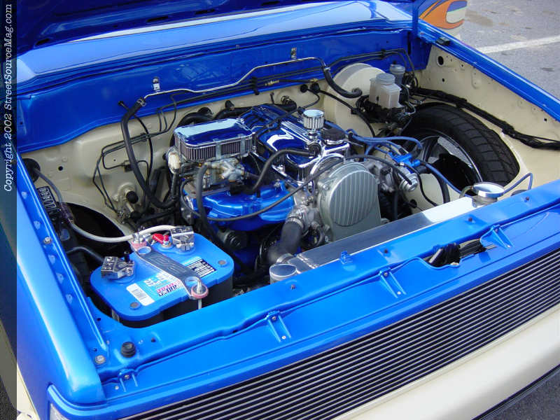 Almost near completion, Andrew focused under the hood of his Mazda. First, the firewall was sandblasted and two-toned to match the exterior. Next, the block was painted House Of Kolor Trublue. Andrew had the valve cover chromed and installed a Weber carburator.  The factory radiator was removed and replaced with an Afco aluminum model, helping to keep the Mazda running cooler on those hot Mississippi summer days. The unsightly plastic overflow tank was trashed and replaced with a shiny new billet model. The exhaust duties come from a high-flow Flowmaster system. Finally, Andrew installed an Optima blue top battery, to match his now completed Mazda.