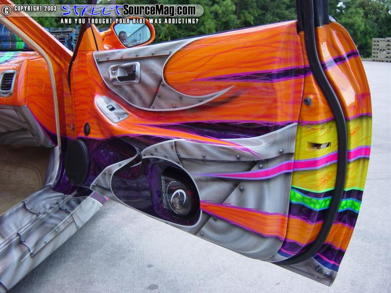 The graphics flow perfectly from outside, through the doorjambs and into the interior. The graphics coming up the hood flow nonstop across the dash as well. There were also a few pieces painted like armor plate to match the armor plate paint on the bottom of the car.