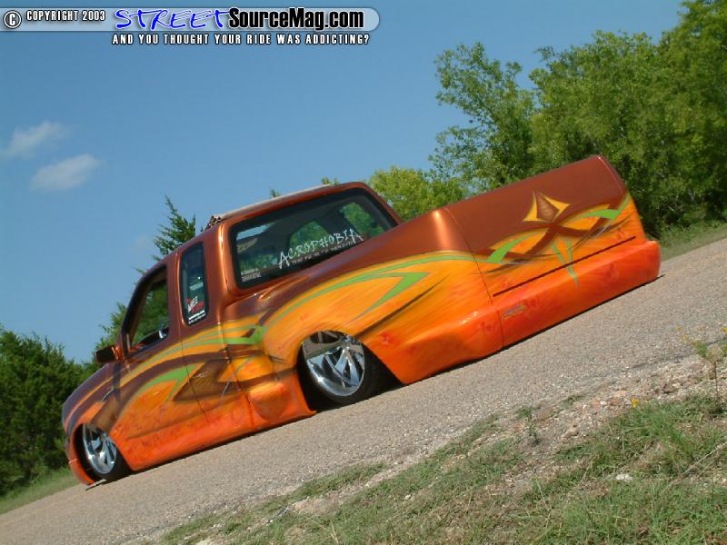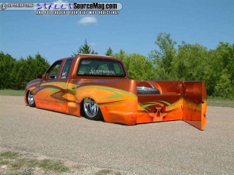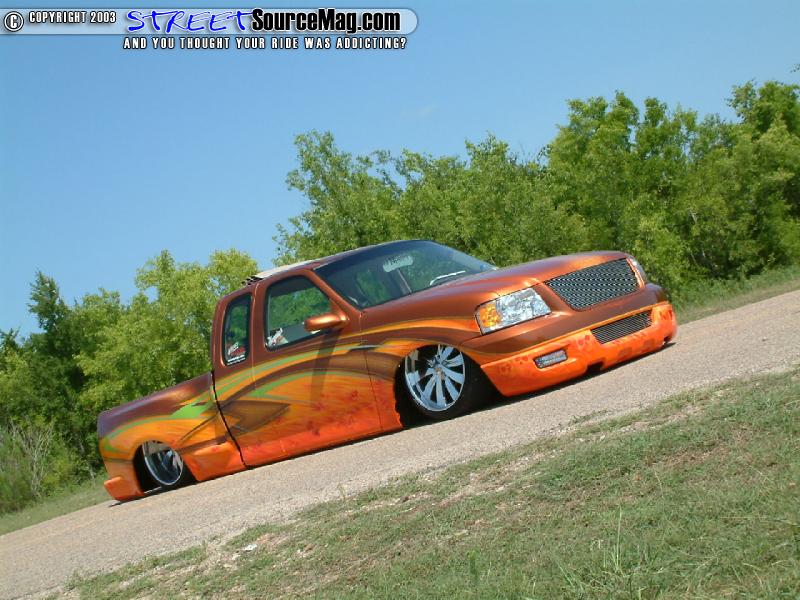 To compete in this industry you have to have knowledge of what people like to see when thumbing through magazines or walking the shows. For David this vision was simple, big wheels on big bodies laying flat on the ground. So to come true with what was wanted he would first drop the F-150 off to Anthony Rhodes of R.A.W. While in Anthony's hands the frame would first be boxed and reinforced.  He would use one of his RAW notches to allow plenty of clearance for the rear end, which had been narrowed 9-¼ inches. Next the driveshaft would be taking to Advanced Driveline of Orlando, FL where they would cut it down 1-½ inches for proper alignment. To help bring the big Ford down, Anthony would build a custom rear bag set up allowing the bag's to go through the frame for ultimate low. Finishing off the rear a custom triangulated 4-link would be installed.