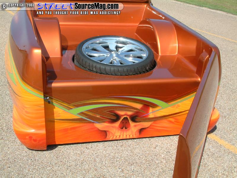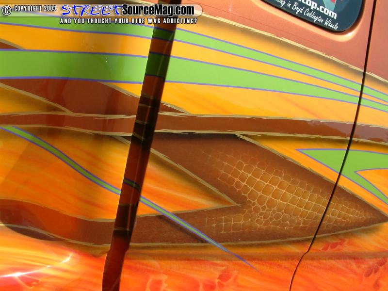 With the exterior prepped and ready for paint David would take it to Todd Fisher of Deland, FL for his paint expertise. Todd would pull out many House of Kolor paints to complete the look David was envisioning. Cinnamon pearl would be the base color along with Sunset, Tangelo, Chrome yellow and lime green in the form of some killer graphics.