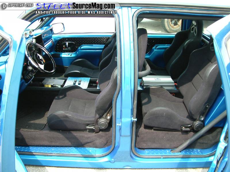 With the exterior complete it was time to turn all attention to Duck's interior needs. The dash would first be smoothed out and painted along with the door panels and other interior pieces.   Diamond plate can also be found in the door panels to help break things up. The headliner would then be wrapped in leather. The stock seats would be moved out and in their place a set of Rative Racing seats would find their way in front and rear.