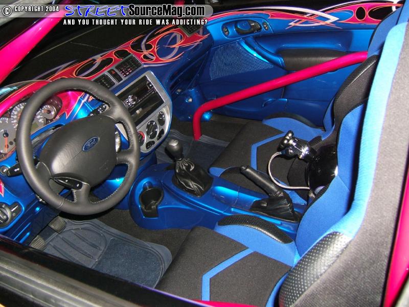 Next a fully fiberglassed dash would be set into place along with door panels, rear cargo area (which involved glassing where the rear seats where located) and a custom painted roll cage. Specialty Designs billet doorsills and center dash inserts would also be installed. Not yet complete Kyle would install a full Audiobahn Flame Series Stereo Setup in a custom fiberglass enclosure painted to match the exterior graphics.