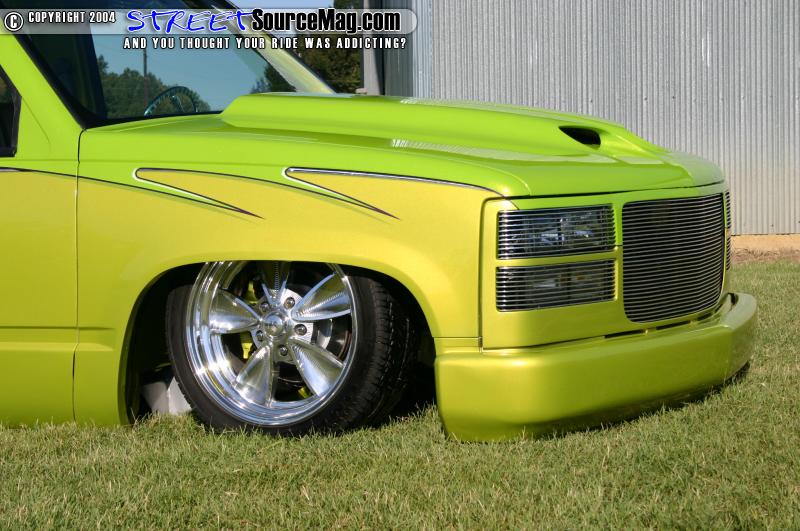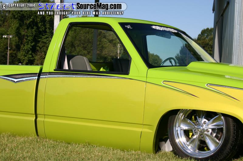 Moving on to the bed the tailgate was molded in along with the roll pan, and the gas door was shaved and relocated into the bed. Underneath the body of the truck lies a fully shaved, boxed and painted frame. This one of a kind frame was built sturdy to work with the full air ride suspension. Marks air ride setup consists of a lot of chrome, crazy mounts, DJM spindles, custom-built chrome 3 link, and air bags all around.