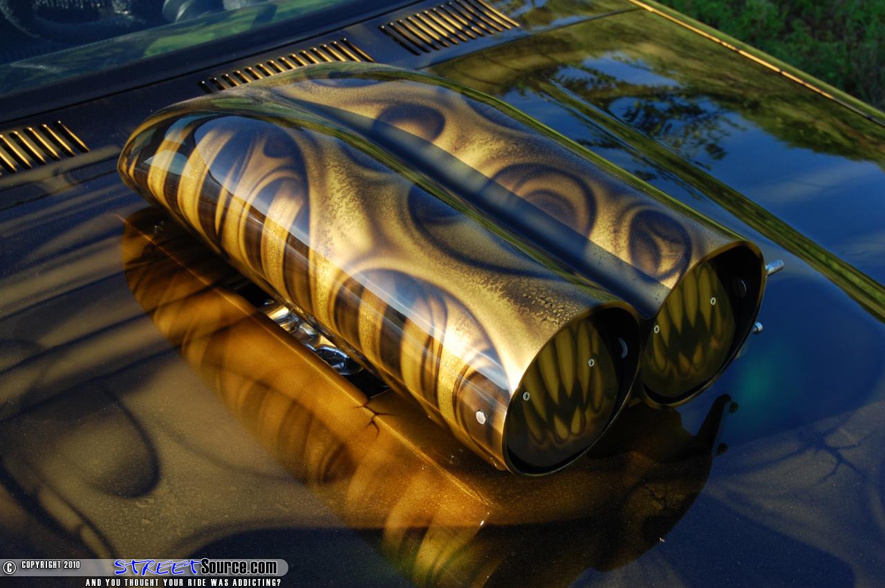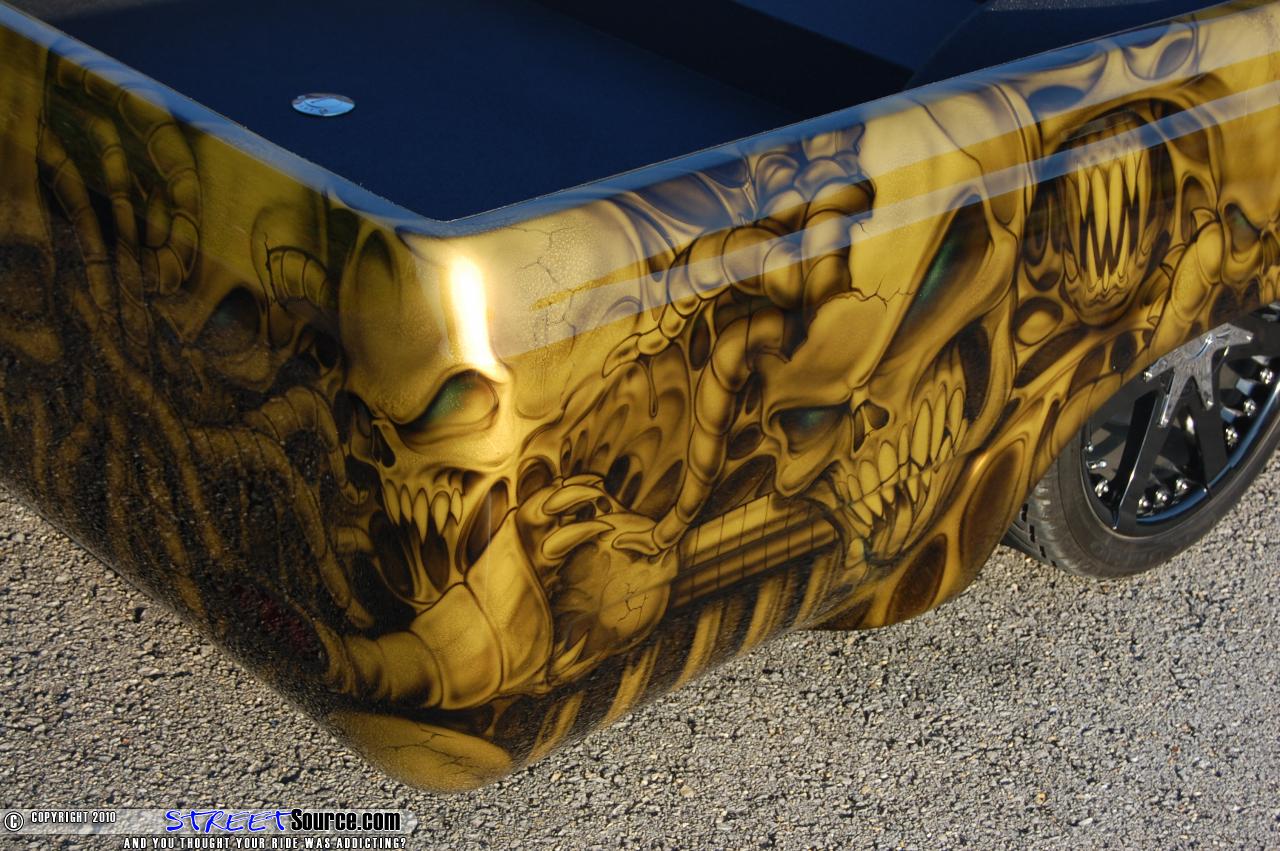 When it comes to setting your sights on the cover, your paint job really has to grab some attention. With this as his goal, Kyle set out to blow everyone away. Before the paint hit the truck, another crew of tight-lipped friends were assembled. Starting out with a Toyota 4Runner front end, Kyle and his friends Steve Faston & Josh Zumwalt proceeded to shave everything they could, even rounding the bed corners to be as clean as possible. A hole for a 40x40 rag top was cut and then it was time for some paint. The base coat and clear were handled by Jon Wiggins of Creative Classics. The airbrush was wielded by Jonie Nichals also from Harrisonville, MO. You can see this truck several times and still catch something in the paint you missed every other time you looked at it. The interior of this wicked truck was the brainchild of Kyle himself. Wanting something truly evil looking, Kyle built a fully one-off interior using rolled steel and whatever could be found and integrated them into the theme. Once the fabrication was done, nearly everything was covered in spray on bedliner from Ameriguard. The dash features Dakota Digital gauges so Kyle can keep tabs on his speed and everything else. What would an evil truck be with a factory four-cylinder motor? NOT EVIL. With that in mind, Kyle shoved a Chevrolet 350 engine under the hood complete with a mild cam, Holley high rise intake and Edelbrock 600 carburetor. Joey Bails handled modifying the 700r4 transmission that keeps Kyle cruising this truck down the highway. Kyle would like to thank Guilty By Design, Tim's Muffler, Ameriguard of Lee Summit, Creative Classics, Robert's Tire, Solor Pro, Clint's Alignment, Bob Sipes, Josh Zumwalt, lil Kyle, Jon Knap, Leon Bearce, Jon Wiggins, Jonie Nichals, Steve Faston, Jamie Taylor, Pig, CJ, Henry at Automotive Again, Shawn Yoss, Mike Baker, Fake Uncle Doc, Dale & Evlyn for the garage space, Mom & Dad, wife and daughter as well as anyone else he forgot but answered their phone when help was needed.