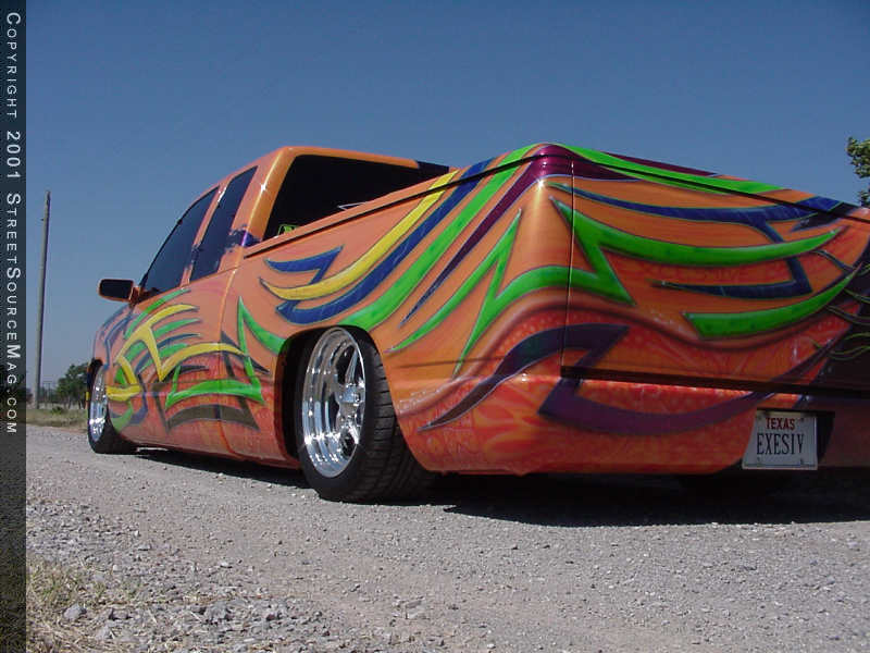 So after dramatic changes in life, it was time to take the truck to new standards for all to follow. To accomplish this, Tom relied on the professionals of Maxed Out Paintworx of Houston TX. The first thing at hand would be to bolt up a Cowl hood to give the front some attitude. Next, the front bumper was sectioned 4 inches and recessed an additional 2 inches to give the front an even smoother look. To complement the bumper work, a Precision billet grille was installed.
