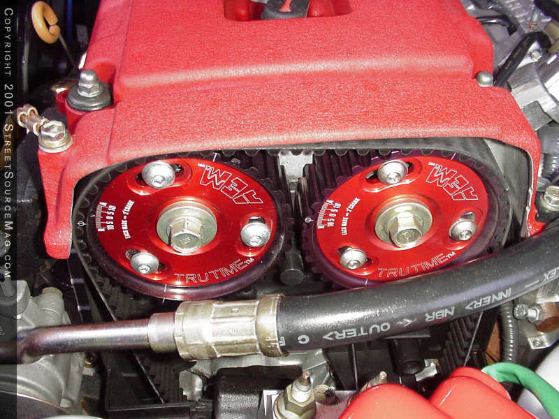 That, along with the AEM short ram air intake, while going down the road hitting the rev is a noise any import enthusiast would enjoy!  Now with the proper breathing, the use of MSD 6AL distributor and Blaster 3 coil were installed with Magnecor wires to provide the correct spark to the plugs. To push the power through to the front tires, the use of a ACT clutch and pressure plate where installed. Now Ryan decided to spiffy up the engine bay by installing a red Type R valve cover.