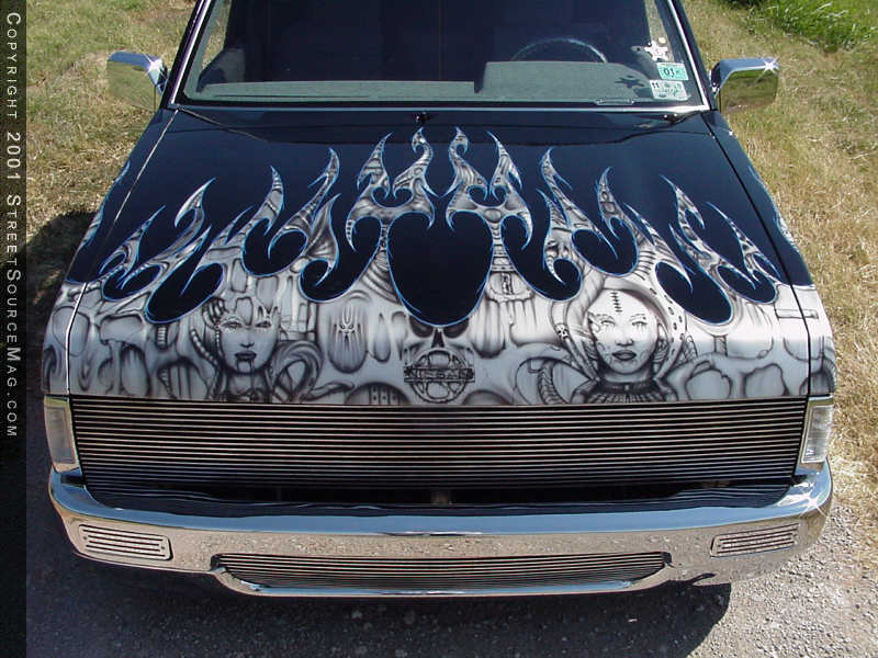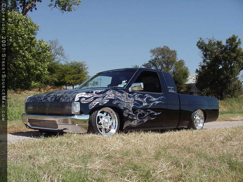 One of the first steps Brian had in mind for his mini would be to lay the stance down to huge mother earth. In order to accomplish this feat Brian would need to turn to Sean Thurman of Lewisville TX for help. While in Sean’s hands, the rear frame was notched and a custom 4-link was made and installed. To get everything to lay smoothly to the ground, Sean also constructed tubular cross-members throughout to replace the stock bulky ones. The next step would be to install a set of Doestech shocks up front along with bagging all four-corners for adjustability on the fly. Brian’s decision to work the body would be one of strategic planning. To give the ’92 Hardbody a newer look, Brian decided to bolt up a ’96 hood along with a set of ’96 pathfinder fenders.