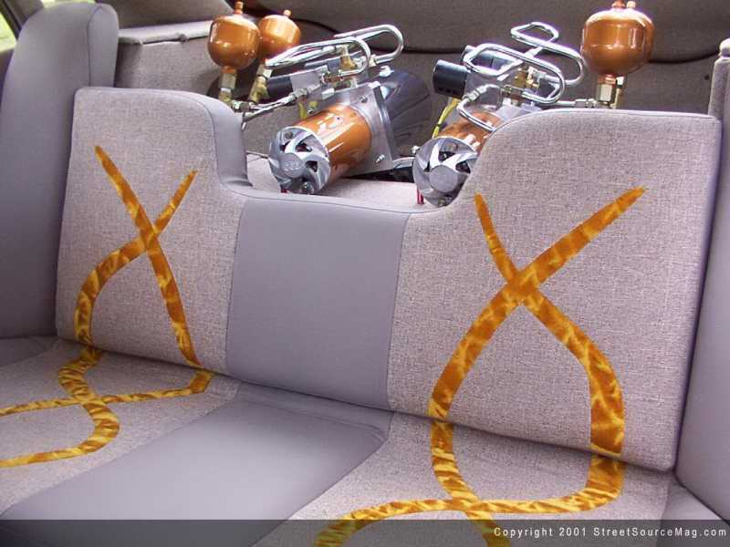 The seats were also tweeded with some tan vinyl on the back and sides and some orange velvet inserts running through the center. The tops of the front seats were cut down to give them a low back look. The rear seat was also cut down and sectioned in the center to give room for the hydraulic pumps to stick through. The rear seat was also wrapped in tan tweed and vinyl and had the orange velvet inserts stitched in the middle of them to match the front seats.  The door panels were shaved of the door locks as well as the interior door handles and arm rests. This gave the doors a smooth, custom look to them. When the tweed was put on the door panels, Tommy also added the same orange velvet inserts as the seats. While the interior was out, the dash cluster was painted to match the car and the steering wheel was swapped for a Grant model. Tommy did all of the interior work with the help of Number 1 Upholstery in Wilmington.