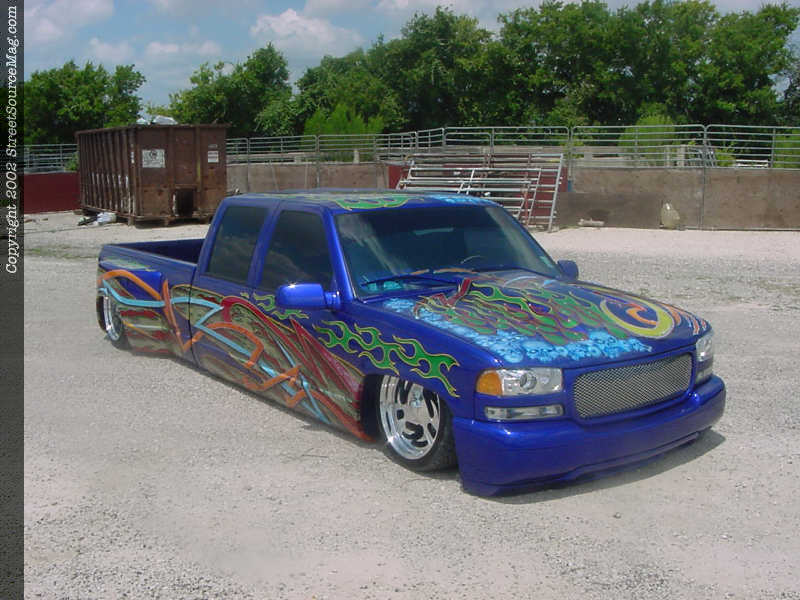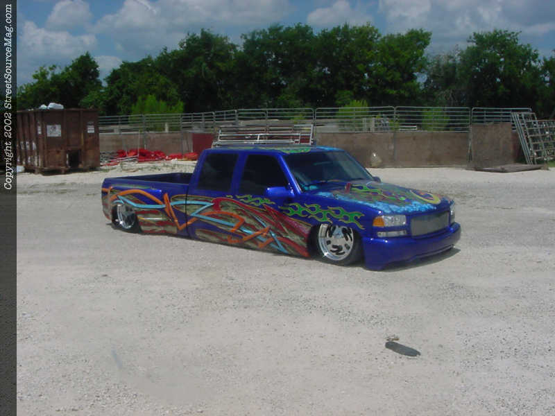 Beginning with the suspension Jason new he wanted to go low, real low. In order to get the truck down where Jason wanted it he junked all the factory suspension. Replacing the front suspension is a set of upper and lower tubular control arms; 2" drop spindles and a set of 2600lbs firestone airbags in place of the factory coils. Out back Jason replaced the leaf springs with a 2-link and a matching set of airbags. While bolting up the 2-link in the rear Jason made sure to notch the frame high enough to let the frame set on the ground.