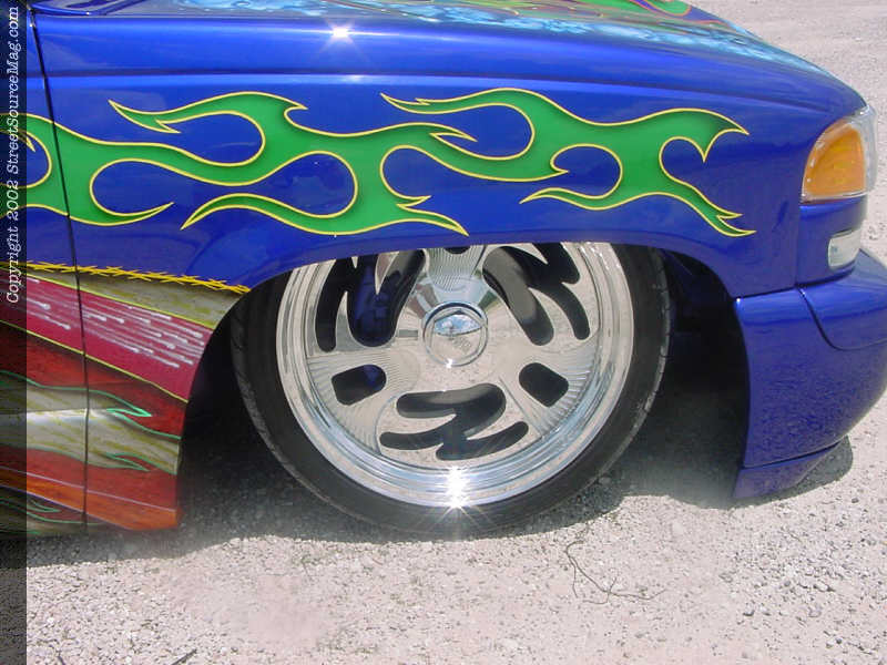 With the air-ride complete Jason was still not satisfied with the stance of the truck, so he took it upon himself to body drop this massive truck 4" to let the rockers hit the pavement. As for rollin stock Jason chose Colorado customs Rush wheels, 20x8 up front and a whopping 20x12 out back.