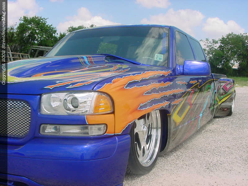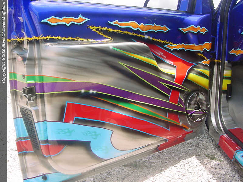 As for the interior it is just as rad as the exterior. Jason took the door panels, dash and even the headliner and fiber glassed them smooth. With those parts smoothed out, he then had the painters match the exterior graphics exactly with the interior.