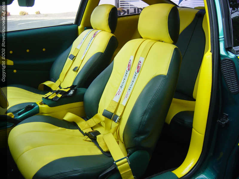 Several of the interior trim panels have also been fiber glassed and painted yellow while the remaining panels have been wrapped in green tweed. The seats are a combination of green and yellow leather from Katzkin. The factory front seat belts have been removed in favor of a set of Weapon R racing belts. To control this one of a kind Cavi, Chris chose a yellow leather Isota steering wheel for its look and feel.