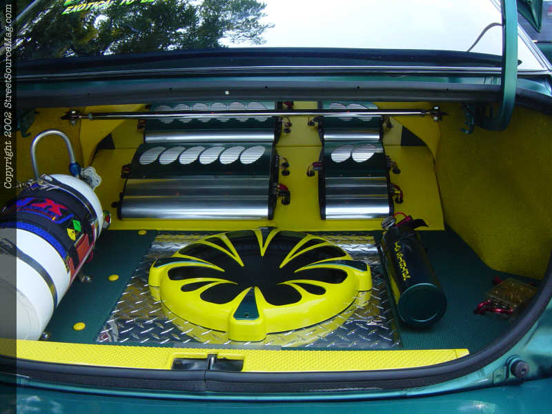 For entertainment to and from shows, Chris has personally installed a full audio/video setup. The system starts out with an Alpine head unit and a Clarion Pro Audio EQ and Bass Kick. From there the signal is fed to a pair of Coustic amps then off to his Memphis mids and tweets and his Kicker VR 15, which is mounted in the spare tire well. To round off his system there is a Sony PS2 mounted where the factory glove box was and a LCD monitor in both of the sun visors.