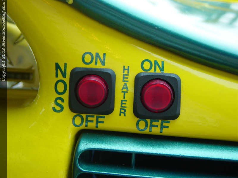To expel the gasses out of the motor, there is a RK Sport header led to 2.5 inch tubing and an Apex 1 M1 muffler. Now that Chris has the motor strong enough to handle anything, it was time to hook up his full nitrous system from Nitrous Express. This system is a 50 shot complete with a purge and a bottle warmer to make sure the gas will be ready when he chooses spray the motor.