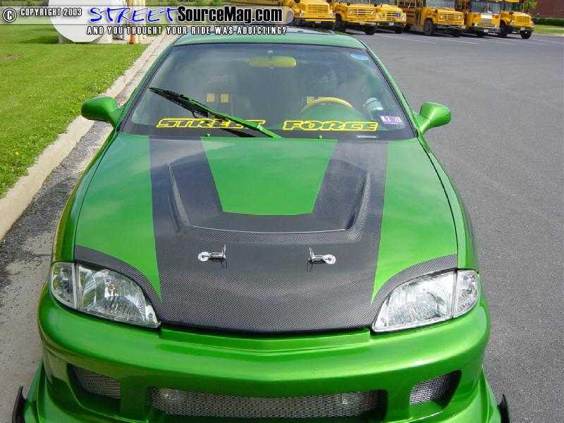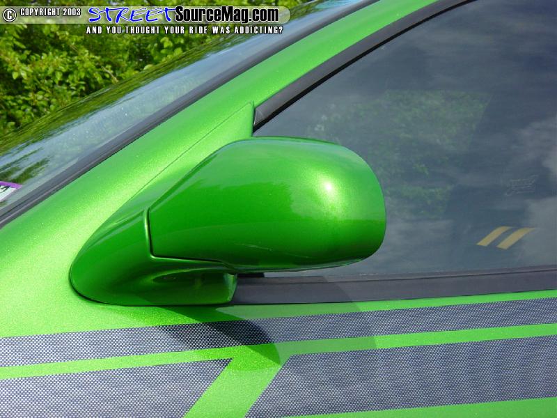 Sounds weird, but over in Japan, this car is a Toyota Cavalier and just like a Honda, they have parts on them that we don't have here. The mirrors he added fold in like most of the imports out today. The factory ones were solid units.   Chris has also added a ton of carbon fiber to the body of his car. These parts include door handles, trunk plate, wing and front and rear splitters. Once the body was prepped and ready for paint, it was time to lay down the 3 stage custom mixed shade of green.