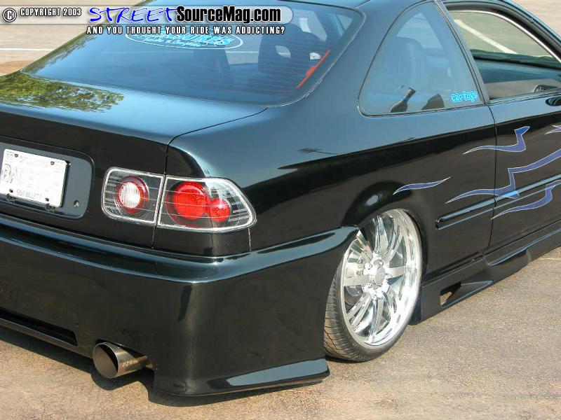 Gotta get rid of any dimples, so she also shaved them all - well, the door handles, antenna, wing, and emblems that is to create a much smoother and cleaner look. To complete this $25, 000 dollar look the crew at Custom Concepts in Oklahoma City slathered the beauty in Black Flamingo Pearl and accented the Honda's new features with Blue Marble tribal graphics.