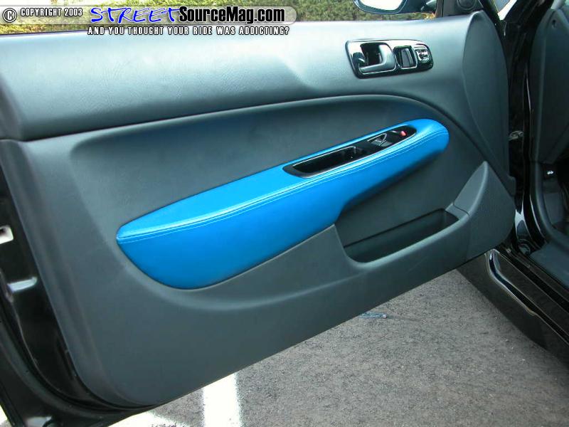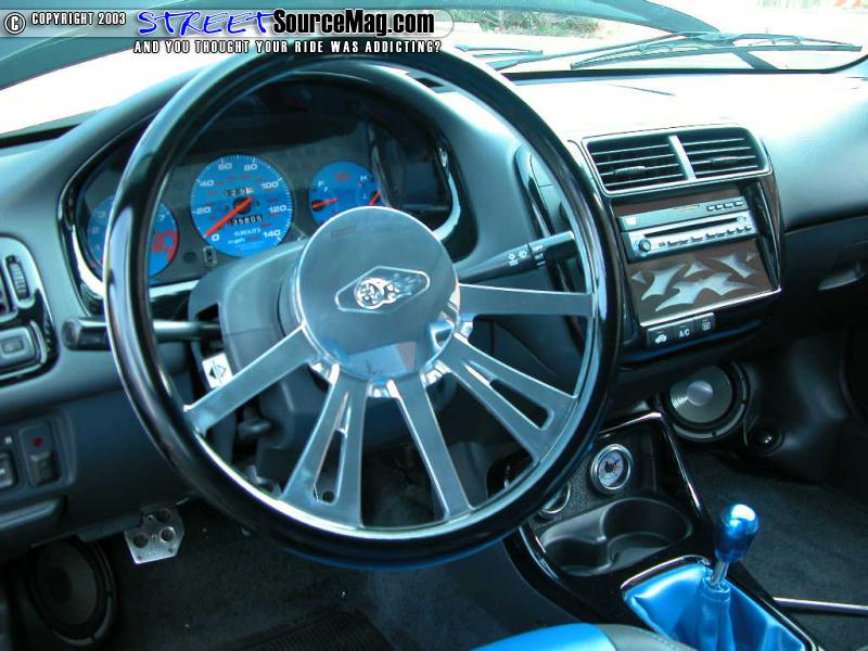 For some girls beauty is only skin deep, but Lindsay had no problem overcoming that shallow idea as she turned her attention to the interior of this vixen. With the help of Lopez Upholstery, Lindsay wrapped the door panels, the custom fabricated kick panels, and seats in charcoal and blue vinyl.   She also had all the existing accent pieces smoothed and painted, upgraded to the blue Indiglo gauges and opted for the B.A.D. Gunslinger steering wheel to enhance the rest of distinct body mods.