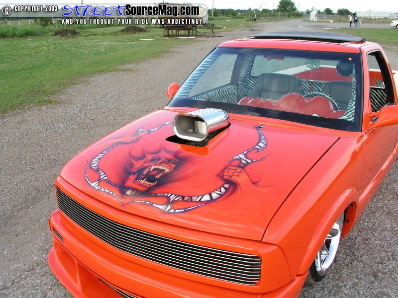 Once Dustin had the truck looking at its best externally along with under the hood it was time to shift attention to the interior. Dustin decided to pull out all the stops once again and go all out on the interior. Dustin took the dash of a 2000 Pontiac Grand Am donor and reworked it to fit inside his Dime. It was then shaped and glassed to make it look like it truly belonged in it's new home. The dash was then treated to the same Tangerine hue, as was the exterior. The floors, misc. dash pieces, door panels