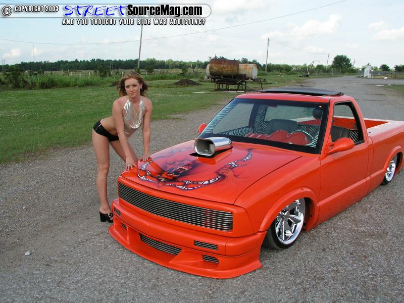 Now that Dustin had everything meticulously back into place it was time for some Bling-Bling, so Dustin decided on 18" Y2K Edge chrome rollers wrapped in 215/30/18 Nitto skins. So what's next I mean the truck has one helluva built motor, it now sports a body dragging stance and to boot it's got more Zebra print then the local zoo, Cause he killed em' all to build his truck, OK OK I'm just kidding about the dead zebra's. Well show it DUH!!!!!! Dustin is not scared to take his truck anywhere at anytime. I've personally seen this truck at shows all over and after giving me the run around for a YEAR Dustin finally gave me the privilege of shooting it for SSM at Greenville this year. The LOVELY C.J. is once again our model of choice.