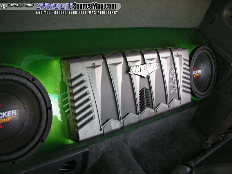 A custom center console was then built to house the air ride control items of the taco. A custom built enclosure was fiberglassed to house Kicker Comp 10's and a Kicker 700.5 amp. A Pioneer AVX-P 7300 was the headunit of choice along with an indash DVD player.   The headliner was then wrapped in gray leather and custom one off Billet accents were custom made to adorn the headliner. To finish off the interior a Colorado Customs Whiskey steering wheel was added to match the wheels that were on the truck.
