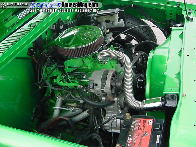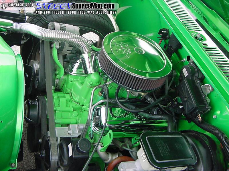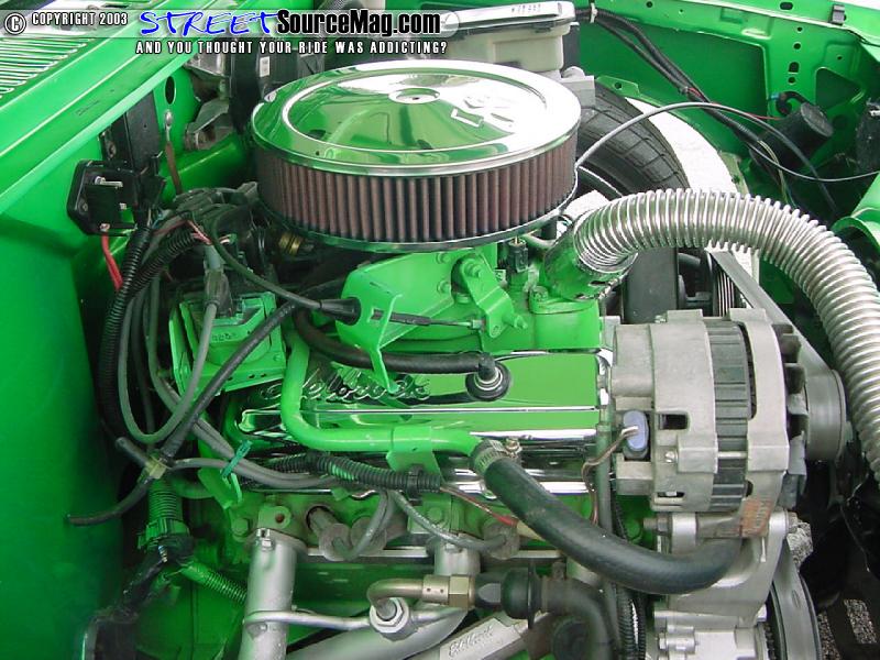In the bed you will find that Daniel didn't cut any corners, he went all by spraying a green bed liner and added diamond plate accents matching his diamond plate bottle rack.   For the engine compartment Daniel pulled the engine and painted everything possible to match the exterior, what wasn't painted was dipped in shiny ass chrome, for the bling bling affect. Along with the paint and chrome Daniel added Cool-flex hoses and a chrome air cleaner cover.