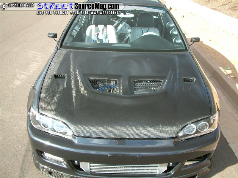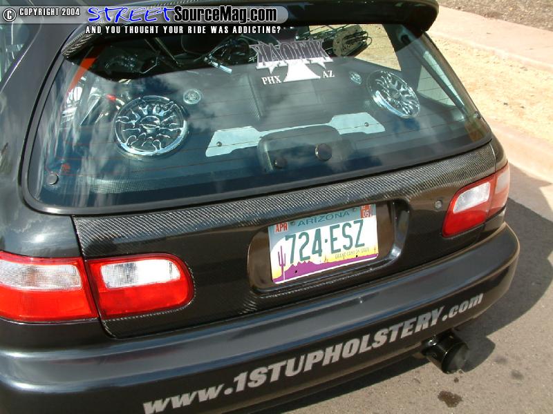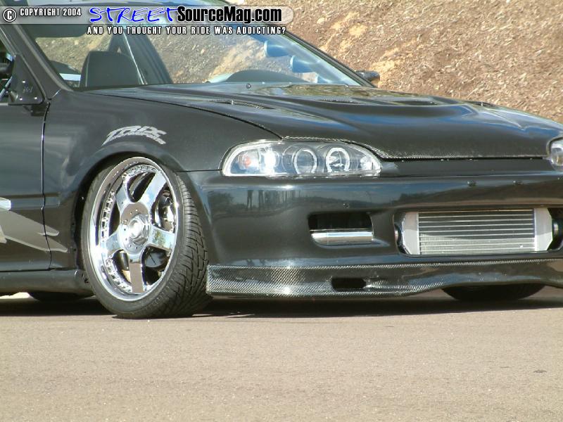 Helping drive all eyes on him, Jeff would begin working the body of his Civic. For starters the stock hood would be ditched in favor of a new VIS carbon fiber hood for a little weight reduction.   Next the stock headlights would be replaced by a set of one-piece headlights with black housing and dual angel eye. Matrix taillights replace the stock tails for an added Import look.
