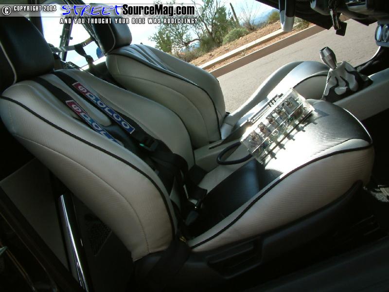 Greddy, reverse indiglo gauges would replace the stock gauges while a set of Integra GSR seats stitched with flames would replace the stock seats.   A Sparco steering wheel and Trenz flamed billet mirror would help the accessories while a chrome roll cage and Sparco 4 point harness are installed for safety. The center console would then be housed with a custom gauge pod housing Greddy gauges.