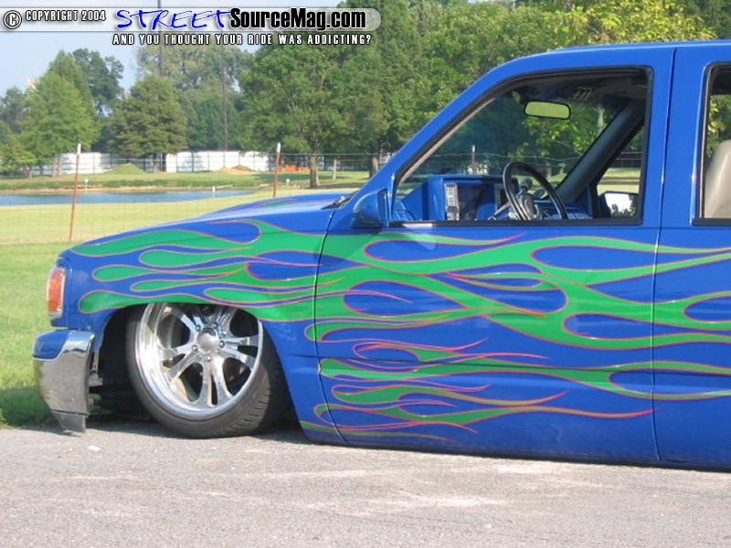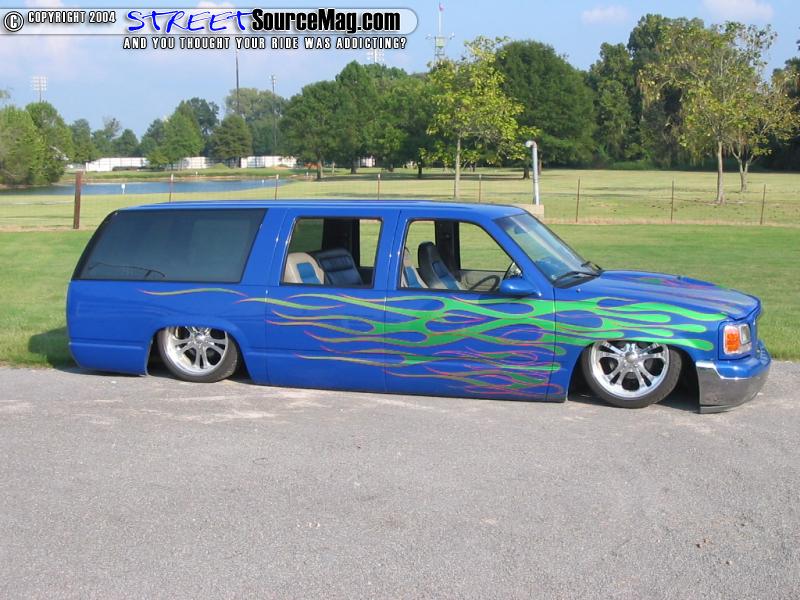 Keeping up with the Cadillac appeal Jake customized the rear of his SUV to incase 97 Cadillac Deville lights, and slapped on a Sir Michaels roll pan. To give it the cleanest look he could Jake had his door handles shaved and suicided the rear doors. Moving right along the truck was almost ready for paint. Mike Contreras would take Jakes ideas and paint the exterior of the SUV Audi Nagaro blue with House of Kolor Lime Gold Candy flames. The flames where stripped with red and orange to give them an accent that would stand out against the blue base.