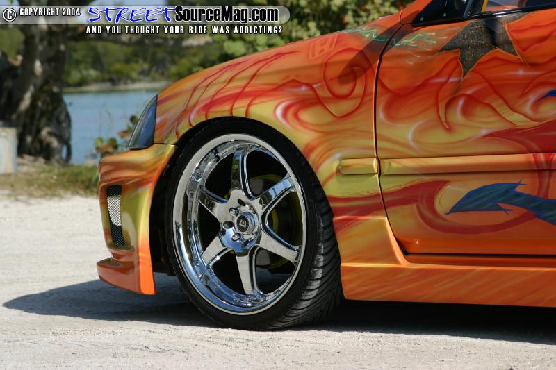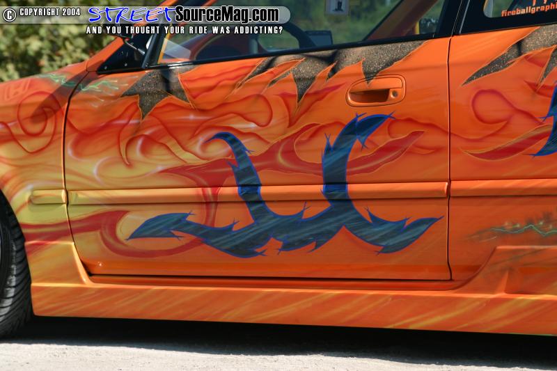 Inside the car Jose fabricated new seat rails and installed a set of Toyota Celica seats in the front. In the rear of the car Jose fit the rear seats of a Toyota Celica as well. The seats were all wrapped in leather. The inside of the car mirrors the exterior of the car with more graphics. Jose then installed a Jensen CD player.