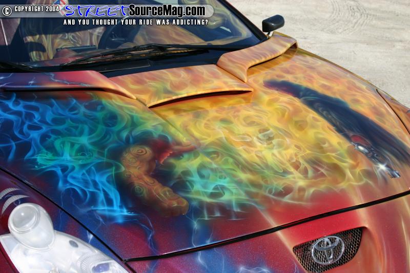With the clean look he wanted accomplished Jose called up Fred Shutrump of www.fireballgraphicsbyfred.com to come up with a graphic design for his Celica. Because Fred was into painting cartoon/comic style graphics he sprayed Jose’s Celica with Hell boy graphics, flames, and slim.
