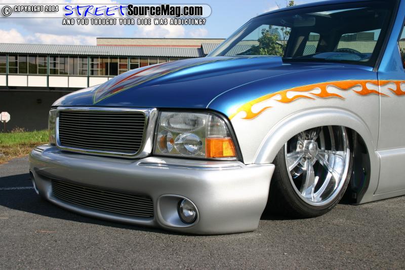 Up front sits a suicide cowl hood, and an Envoy front end conversion. Out back the bed exterior of the bed was smoothed and a custom set of tail lights was installed. Inside the bed the coverers were radiused and the bed was smoothed all the way around.