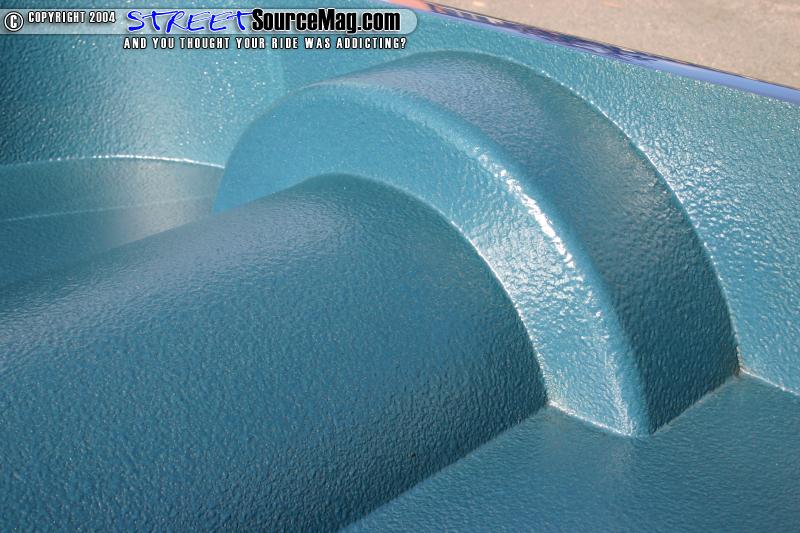 A Hagan gas filler was molded into driver side bed top. The inside of the bed was then fitted with a wheel and bridge covers, and rhino lined. The passenger side door was then suicided and the truck was then on to paint.