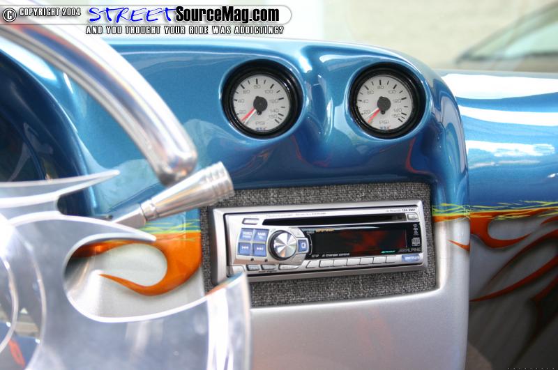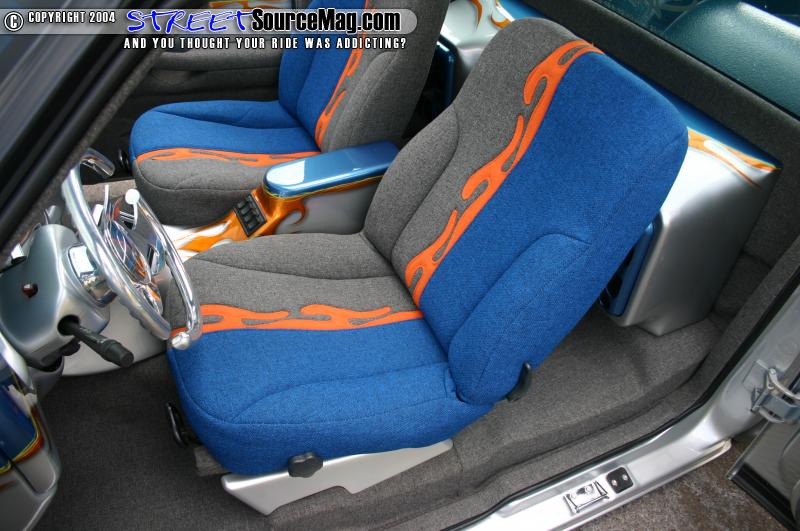 The headliner was wrapped in tweed and the seats were wrapped in blue tweed and grey and orange graphics to match the exterior paint job by Strader’s Upholstery of Milford, DE. Joe’s Car Stereo wired up the Alpine CD player, MS Quart interior speakers, and Kicker Solo baric subs.