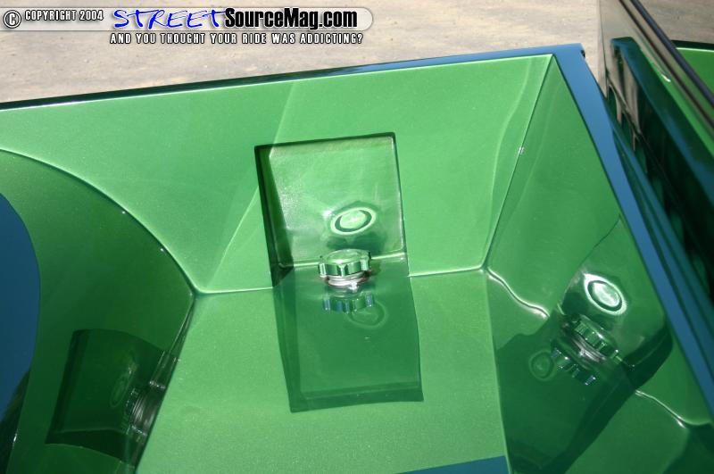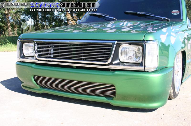 Clear corners sit on each side above the custom fit Toyota front bumper. The hood was modified with a Eclipse bubble molded onto it. A custom set of mirrors was also bolted up to complete the look. Joe Benne then laid down the Dupont green base and topped it off with a set of silver flames outlined in purple.