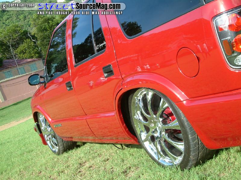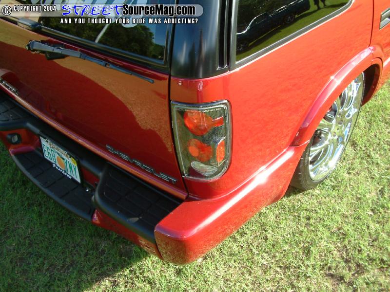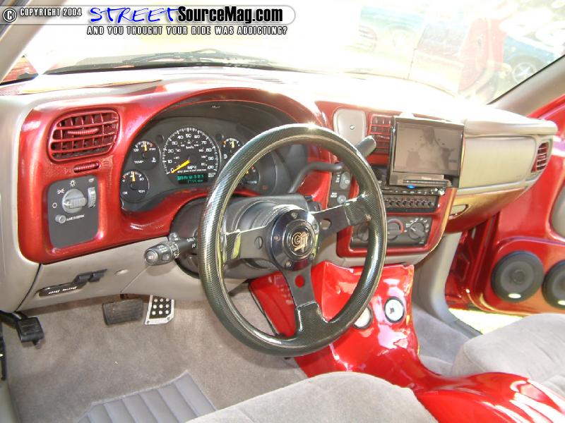 Moving into the interior of Justin’s Blazer, he would begin with adding some paint to the dashboard along with the custom fiberglassed speaker pods on the door panels. Next the stock steering wheel would be replaced with an aftermarket carbon fiber one along with the rearview mirror being swapped out with a lighted custom mirror.