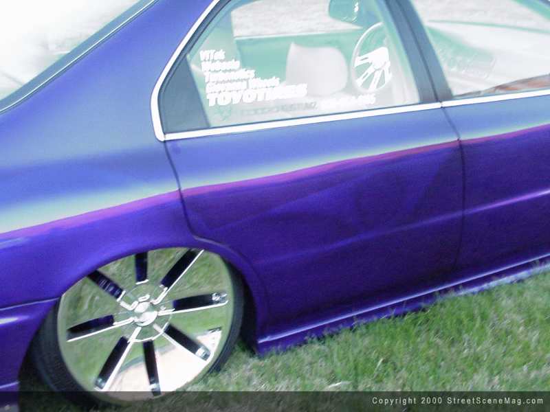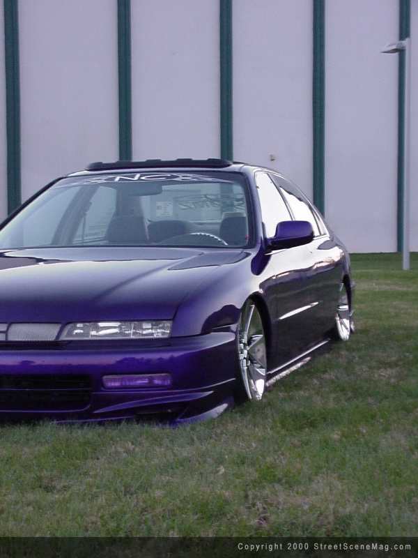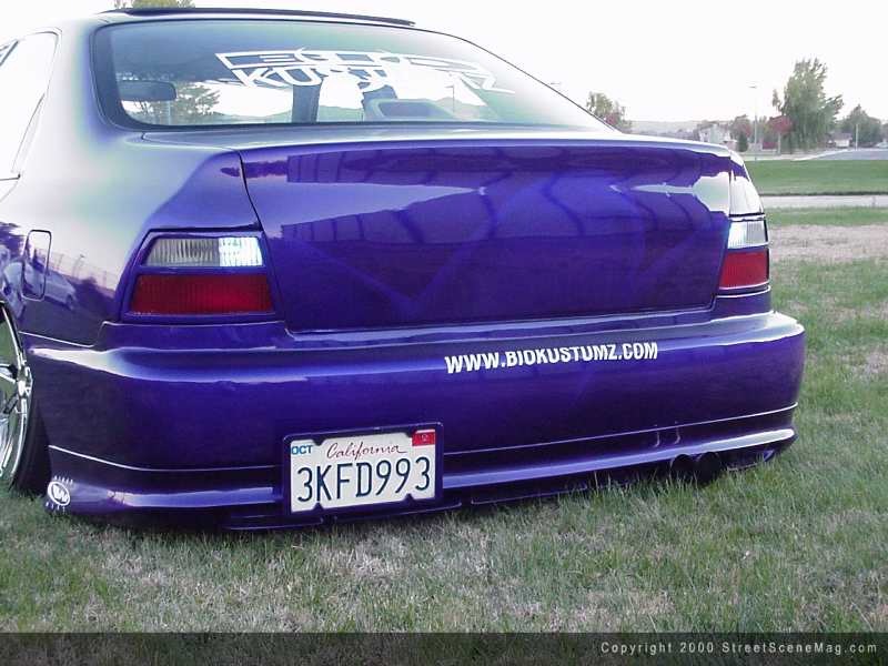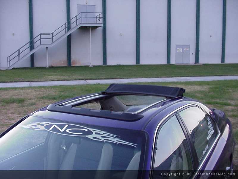 Starting to work his way back to the rear, the door handles and moldings were shaved, and the squirters were relocated. Most people are happy with a sunroof, or just able to roll down their window. Well once again Joe had to go a different route with installing a power sliding rag. Finally to the rear, the first thing to go would be the stock license-plate box, which was shaved. Joe then took rear bumpers from a '94 and '96 Accord and proceeded to graph them together to form his very own bumper.