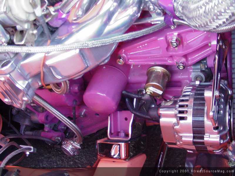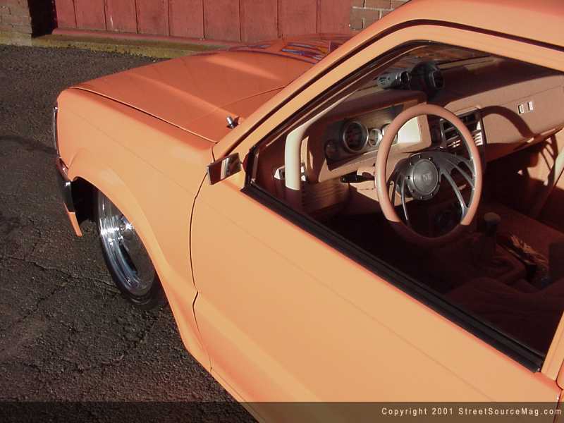 The front would be next on the long list of upgrades. The stock drop spindles would be removed, chromed and reinstalled. The battery would be relocated under the bed for added room under the hood, and Chris would rework the front wheel wells. The added room would work out nicely tucking the 17-inch Centerline wheels, which had been wrapped nicely in 205/40-inch rubber. While tearing into the engine bay, Chris would smooth out all panels including the firewall. Helping to bring things down, a set of home custom built drop a-arms would be installed. With a set of chrome Pro shocks and Firestone airbags in place, the Mazda was now laying flat. The entire air ride system is run with braided Aeroquip airlines along with billet clamps.