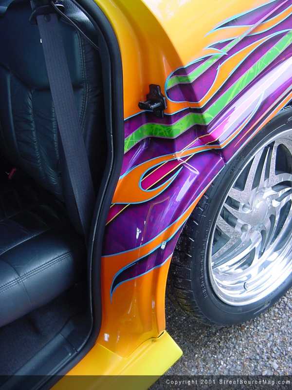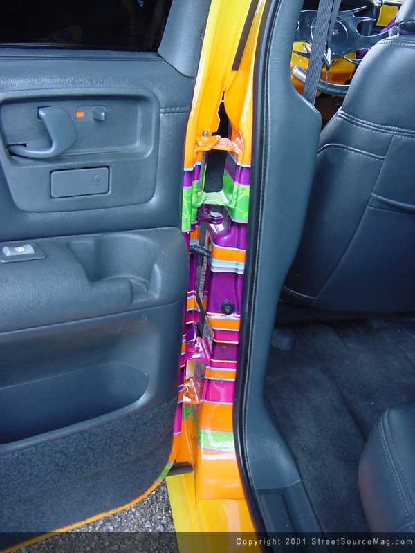 Every single inch of the truck was masked, prepped and sprayed by him in an open shop at night. Pat came to the new shop and sprayed the fade and then Larry sprayed the first coat of clear. The SUV was disassembled and cleared in sections. Larry sprayed it all in House of Kolor clear. After the clear was sprayed, he then sanded it with 500 grit and a DA till it was flat. Pat came over again during the next 3 weeks and striped it. He showed Larry some tricks and let him stripe the jambs and doorposts.