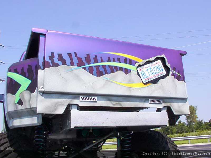 The gas filler door was shaved as well as the entire gas tank and filler tubing to make room for the aluminum 10-gallon tank to be mounted behind the cab between the frame rails. At the rear of the bed, the taillights were shaved as well as the rear bumper and a set of billet taillights were mounted under the tailgate which was also smoothed to match the front of the bed and the rear of the cab.  Now that Johnny was happy with the bodywork that was done to his 4x4, it was time to pick a color that would stand out on the truck. Since he couldn't decide on just one color, Dupont Chromalusion was chosen as the base color. This gave Johnny a few different color flips of its own, but he still wasn't happy with that. The bottom of the truck was sprayed with a gray base then airbrushed to give the illusion of cracked rock. Coming off the front of the truck is a set of orange and yellow flames that extend all the way to the middle of the doors.