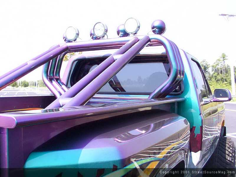Now that we are inside the bed of this Ford, the floor has been swapped for a wood panel floor and stained to perfection and a 3" triple roll bar was bolted in and painted Chromalusion to match the body of the truck. Johnny did all of the work to complete the body of this truck with the help of his friend Mike Boyce.
