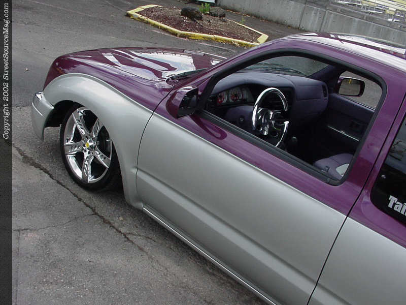 He would install a 4x4 hood with shaved squirters, 4x4 fenders with shaved parking lights and antenna hole for starters. Next a 4x4 front bumper would be installed to finish out the 4x4 sheet metal. Moving down the newfound ride, the door handles would be shaved along with the gas filler door, which would be relocated inside the bed on fender well. Continuing back, an Alter image tribal taillight conversion was welded in place and the stock taillights would be shaved. Knowing that his class is a tough one on the show curcuit, Eric wasn't done with the modifications.