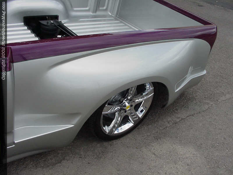 Next the black step pads on the step side would be shaved front and rear of the steps.   Paying attention to detail, the bodylines under the rear window would then be shaved, and to finish things off Eric had a hand built roll pan molded in underneath the shaved tailgate. Tom Jacobs is responsible for the body modifications.