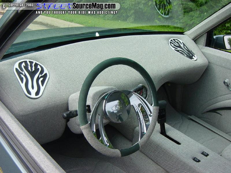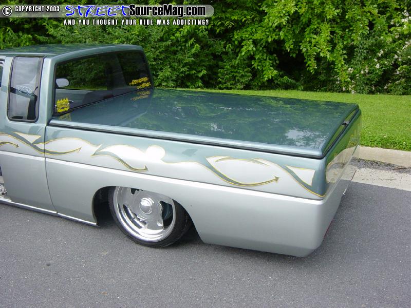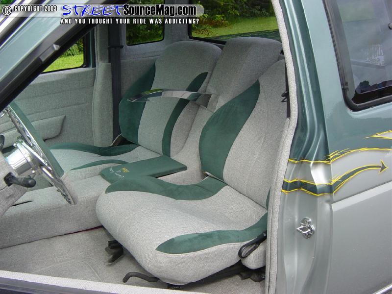 Scott also added an over the rail bed cover to keep the custom gray tweed and green suede, complete with graphics under the cover and throughout the bed panels, out of the weather. Now that the bulk of the work was done and the truck was near completion, it was time to tear into the interior. Not wanting to have the typical cookie cutter Nissan interior wrapped in tweed, Scott decided to use the custom skills of Stitch from Custom Interiors by Stitch to create a one off interior.