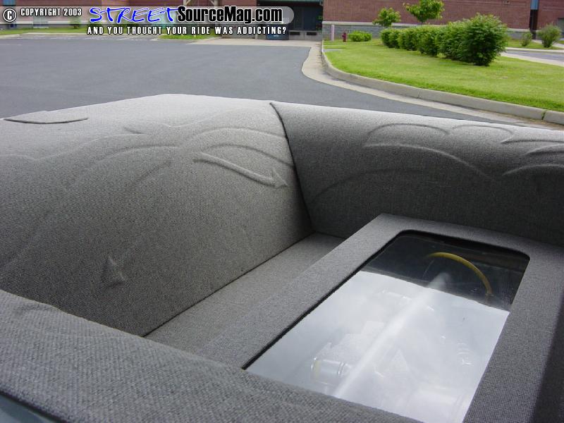 The first thing Stitch had to do was to build a custom dash. Loosing all the heat and air controls and vents cleaned up plenty of room to make a deep slope to the new dash. The CD player was moved to the headliner in a custom mount.   All of the factory gauges were also scrapped in favor of a couple custom painted and relabeled gauges from Classic Instruments. The gauges have the same graphics as the frame.
