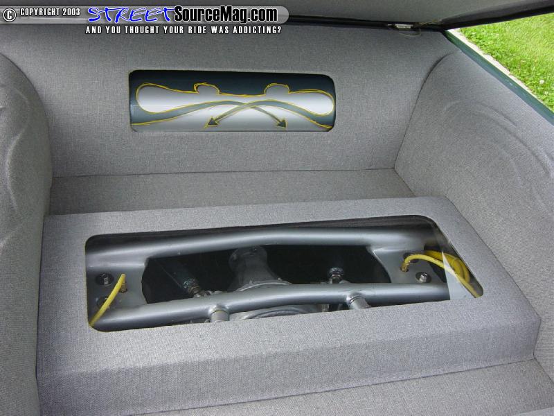Now that the dash was done, it was time to find a pair of seats that would fit the flow of new dash. For that, Scott chose a set of front seats from a Pontiac Sunfire. The seats along with the rest of the interior was covered in gray tweed and green suede with just enough graphics throughout to bring it all together. Stitch also constructed a pair of custom door panels as well.