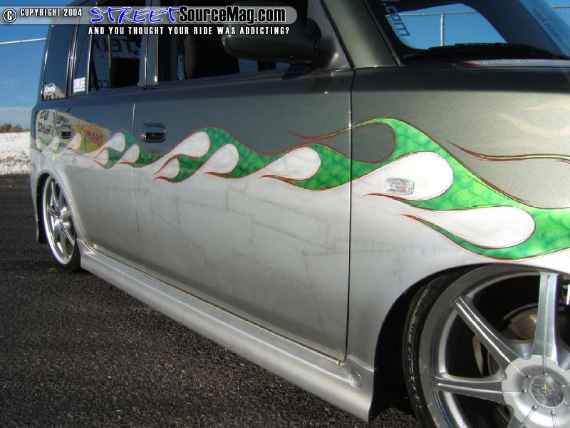 From there, it’s was time for the little box that could to get a face lift. First Phil started with some custom tricks like shaving the rear side markers lights and relocated the exhaust cutout to the middle of the rear bumper. Once that was done, he bolted on a set of Trenz framed perimeter billet grills, bumper grills, and hooking up a carbon fiber hood then it was off for paint. Most people would just hit up their local paint shop to clean their ride up, not Phil, he took his ride to James Cashman of Cashman Customs in Concord, Ca. who is responsible for all the graphics on the Scion.