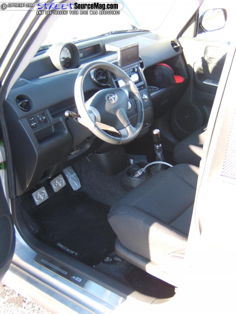 Looking inside the box, more paint is found about, like the airbrushed headliner, dash trim, and console trim which were all painted by your favorite painter, James Cashman. Fender Bender Intl. also whipped up a set of custom billet pedals, for a little bit of Scion love. Phil then added some accent lighting under the seats, dash, and speaker grills. The heart of Phil’s interior modifications is his killer mobile entertainment system, which starts off with a Alpine 6.5 in head unit with DVD player, which mans the two 5.6 headrest monitors. Crystal separates are mounted in the doors and in the dash for all those high notes. A JL 12w3 is mounted behind the rear seats in a custom fiberglass enclosure along with the JL amplifers, which power it.
