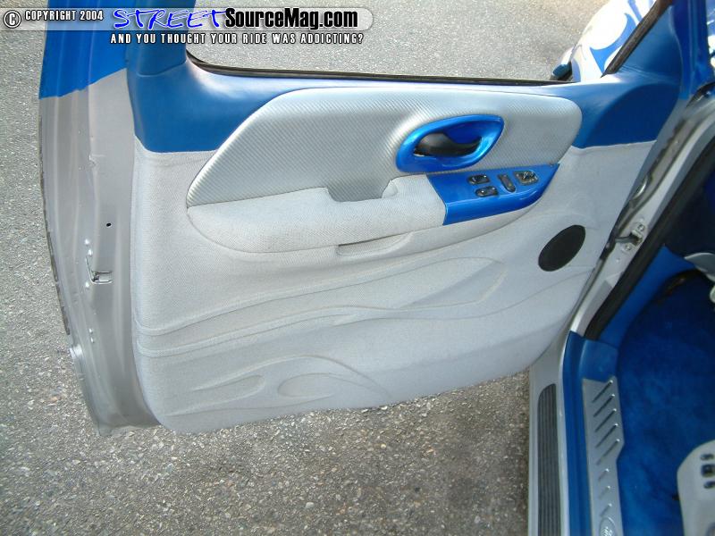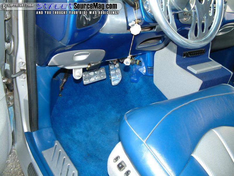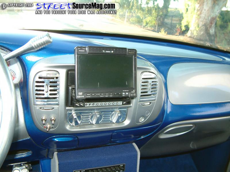 Needing the ability to change out CD’s without looking through a case Robert would then install a Clarion 6 disc changer into a custom center console warped in silver and blue tweed. Two 7-inch monitors would then be installed into the sun visors while a 10.4 flip down would be mounted facing the rear for those tailgaters on the Cali.