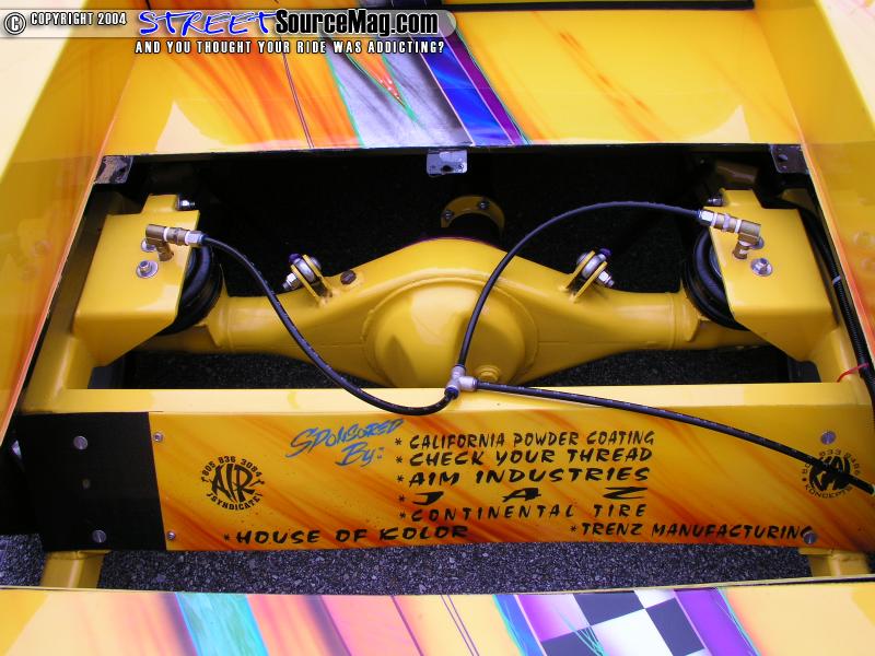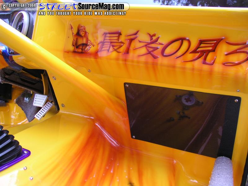 The interior was finished with a handbuilt rollcage. The flooring, dash, and all interior panels were finished up with molded carbon fiber panels. Notice the clean floor mods done for the bodydrop. The entire underside was skinned in aluminum that was later painted to match the exterior graphics.